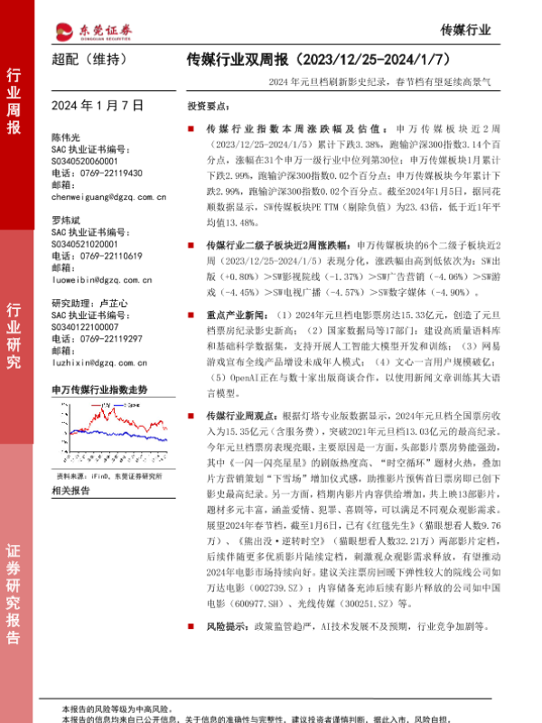 【东莞证券】【20240107】2024年元旦档刷新影史纪录,春节档有望延续高景气-12页 行业研究