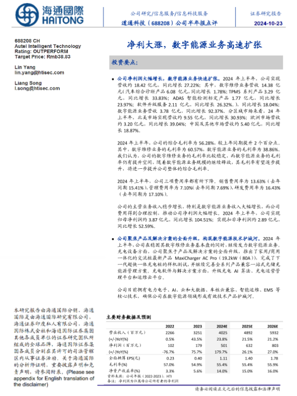 【海通国际】【20241023】道通科技(688208)公司半年报点评:净利大涨,数字能源业务高速扩张-13页 行业研究