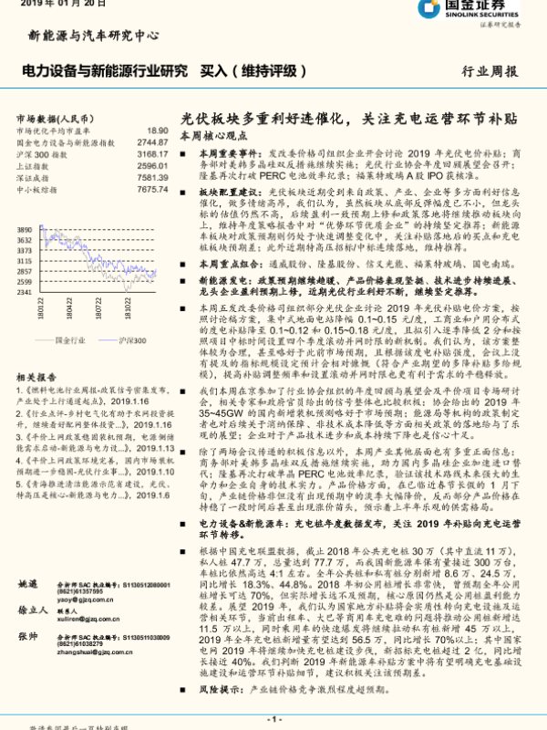 【国金证券】【20190120】电力设备与新能源行业研究周报:光伏板块多重利好连催化,关注充电运营环节补贴-4页 行业研究