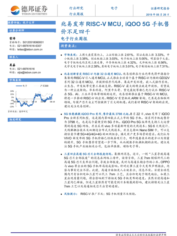【德邦证券】【20190826】20190826-德邦证券-电子行业周报:兆易发布RISC-V MCU,iQOO 5G手机售价不足四千-4页 行业研究