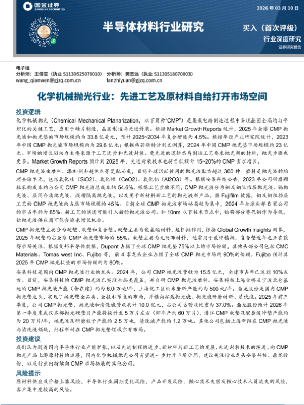 【国金证券】【2024】化学机械抛光行业:先进工艺及原材料自给打开市场空间-15页 证券期货研究报告