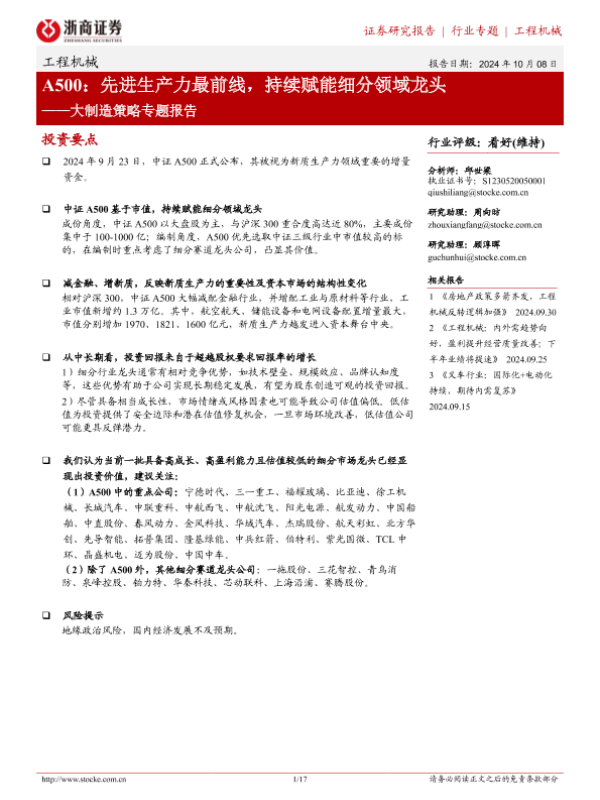 【浙商证券】【20241008】工程机械行业大制造策略专题报告-A500:先进生产力最前线,持续赋能细分领域龙头-17页 行业研究