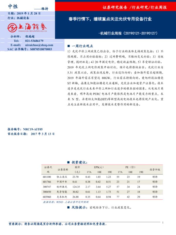 【上海证券】【20190128】机械行业周报:春季行情下,继续重点关注光伏专用设备行业-5页 行业研究