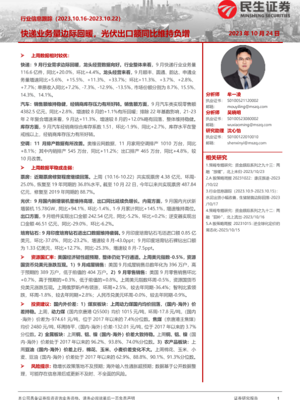 【民生证券】【20231024】行业信息跟踪:快递业务量边际回暖,光伏出口额同比维持负增-30页 行业研究