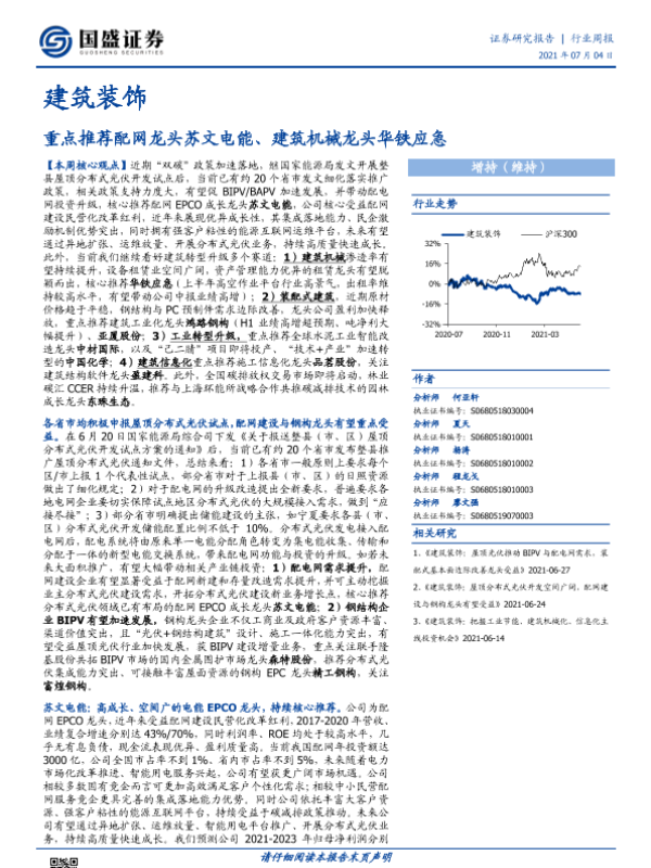 【国盛证券】【20210704】建筑装饰行业周报:重点推荐配网龙头苏文电能、建筑机械龙头华铁应急-20页 行业研究