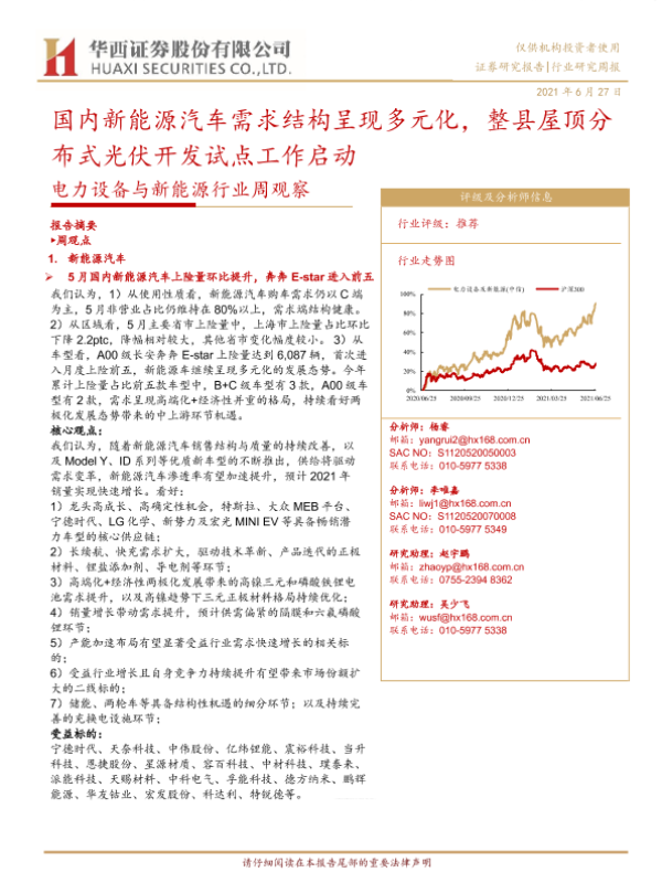 【华西证券】【20210627】20210627-华西证券-电力设备与新能源行业周观察:国内新能源汽车需求结构呈现多元化,整县屋顶分布式光伏开发试点工作启动-17页 行业研究