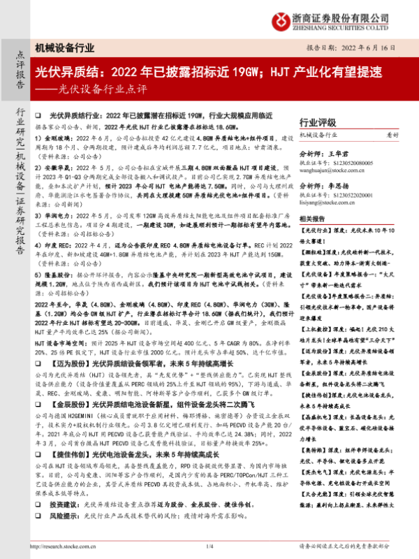 【浙商证券】【20220616】光伏异质结:2022年已披露招标近19GW;HJT产业化有望提速-4页 行业研究