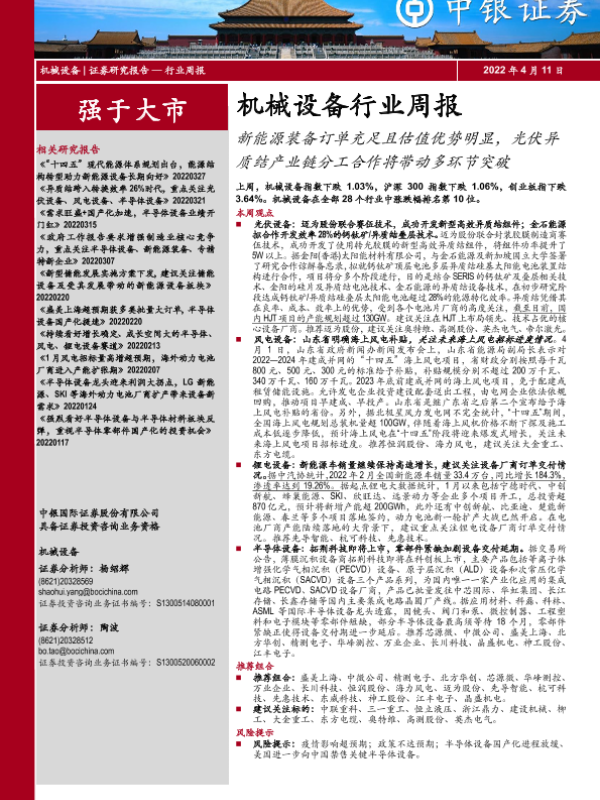 【中银证券】【20220411】20220411-中银证券-机械设备行业周报:新能源装备订单充足且估值优势明显,光伏异质结产业链分工合作将带动多环节突破-17页 行业研究