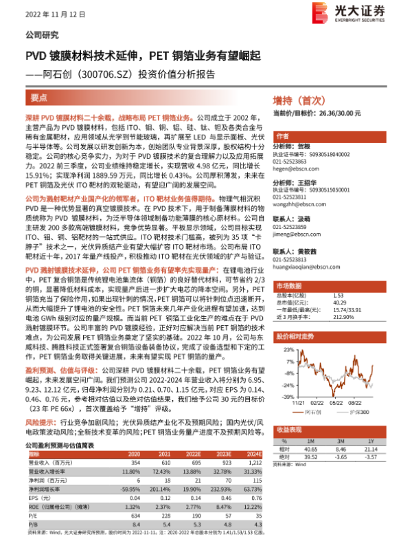 【光大证券】【20221112】PVD镀膜材料技术延伸,PET铜箔业务有望崛起——阿石创(300706.SZ)投资价值分析报告-31页 行业研究