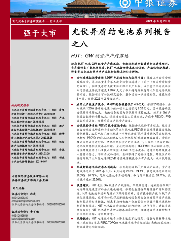 【中银证券】【20210629】光伏异质结电池系列报告之八:HJT:GW级量产产线落地-5页 行业研究