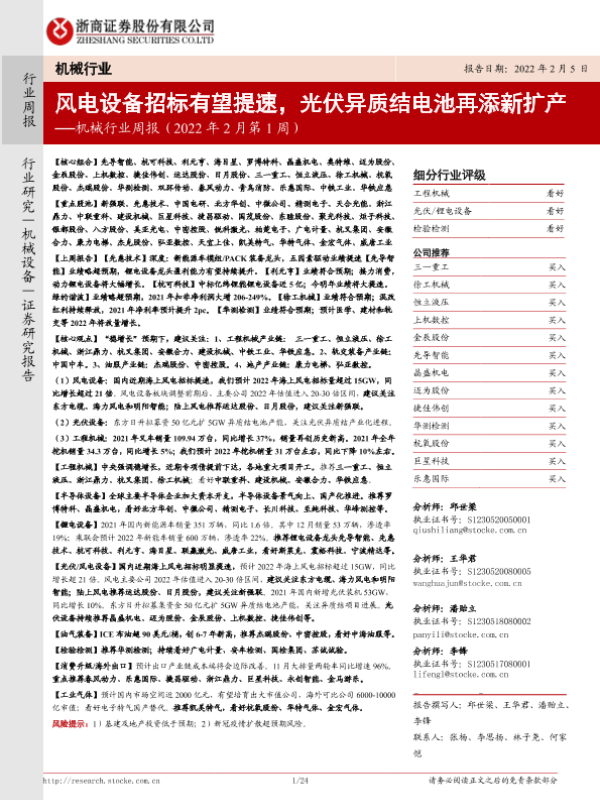 【浙商证券】【20220205】机械行业周报(2022年2月第1周):风电设备招标有望提速,光伏异质结电池再添新扩产-24页 行业研究