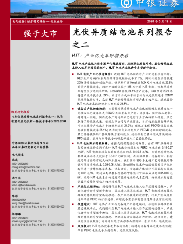 【中银证券】【20200519】光伏异质结电池系列报告之二:HJT:产业化大幕即将开启-10页 行业研究