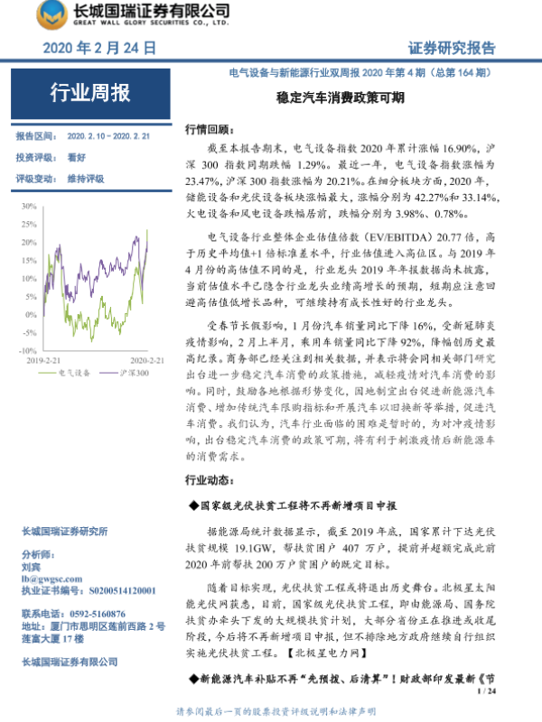 【长城国瑞证券】【20200224】电气设备与新能源行业双周报2020年第4期(总第164期):稳定汽车消费政策可期-24页 行业研究