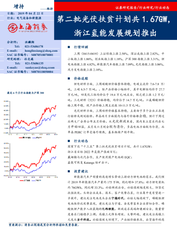 【上海证券】【20190422】电气设备和新能源:第二批光伏扶贫计划共1.67GW,浙江氢能发展规划推出-15页 行业研究