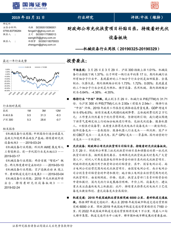 【国海证券】【20190331】机械设备行业周报:财政部公布光伏扶贫项目补贴目,持续看好光伏设备板块-24页 行业研究