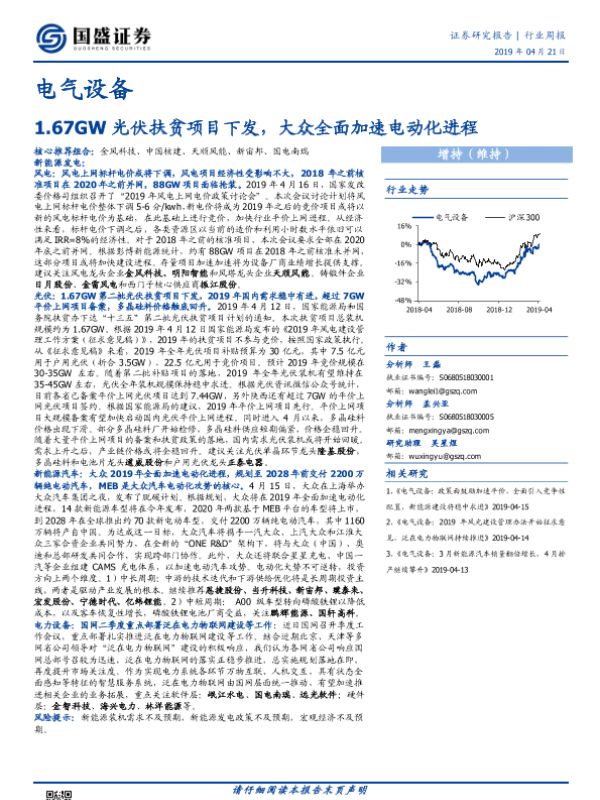 【国盛证券】【20190421】电气设备行业周报:1.67GW光伏扶贫项目下发,大众全面加速电动化进程-23页 行业研究
