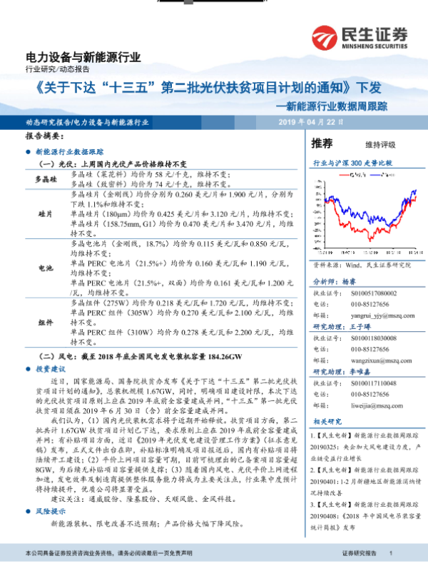 【民生证券】【20190422】关于下达“十三五”第二批光伏扶贫项目计划的通知下发——新能源行业数据周跟踪-9页 行业研究