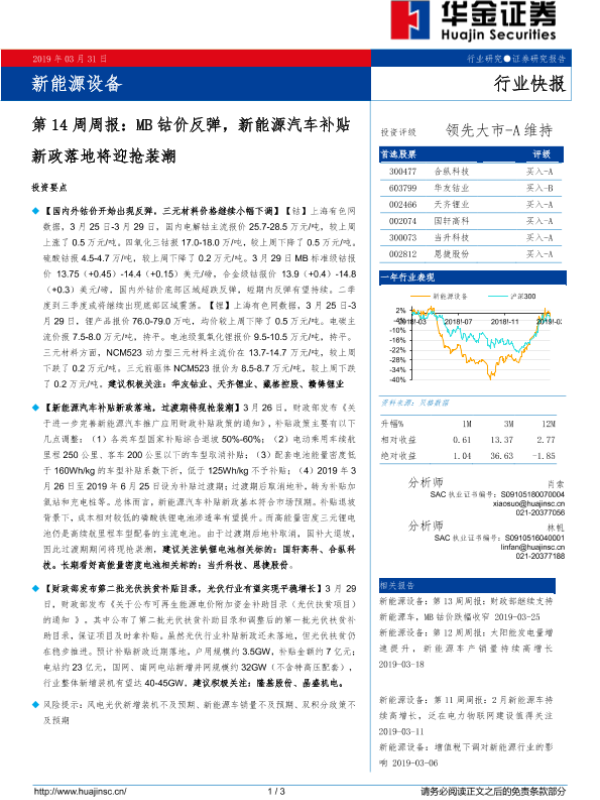 【华金证券】【20190331】新能源设备第14周周报:MB钴价反弹,新能源汽车补贴新政落地将迎抢装潮-3页 行业研究