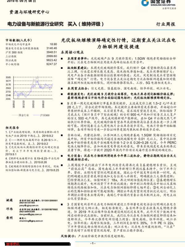 【国金证券】【20190908】电力设备与新能源行业研究:光伏板块继续演绎确定性行情,近期重点关注泛在电力物联网建设提速-4页 行业研究