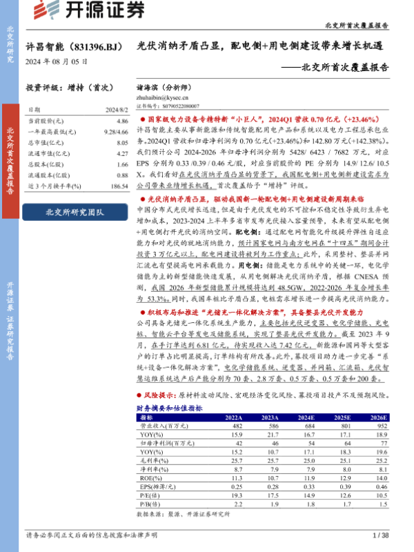 【开源证券】【20240805】许昌智能(831396)北交所首次覆盖报告:光伏消纳矛盾凸显,配电侧+用电侧建设带来增长机遇-38页 行业研究