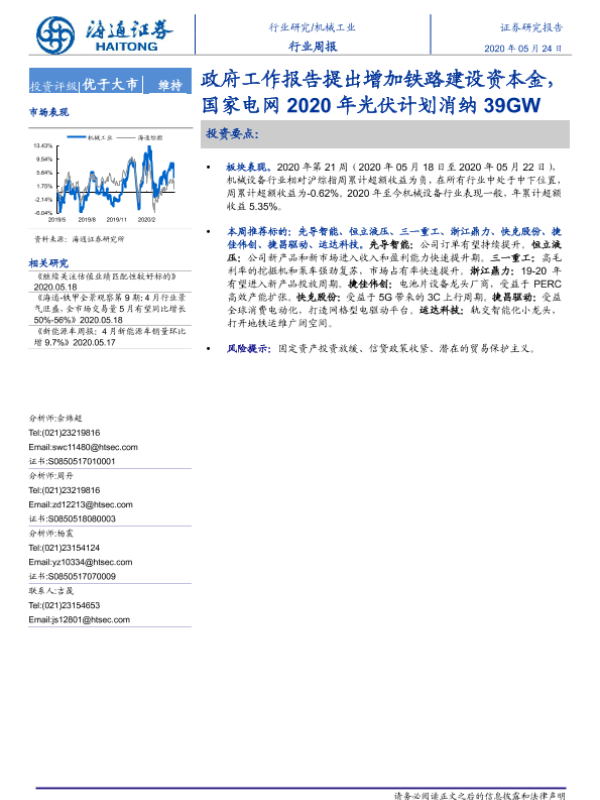 【海通证券】【20200524】20200524-海通证券-机械工业行业周报:政府工作报告提出增加铁路建设资本金,国家电网2020年光伏计划消纳39GW-10页 行业研究