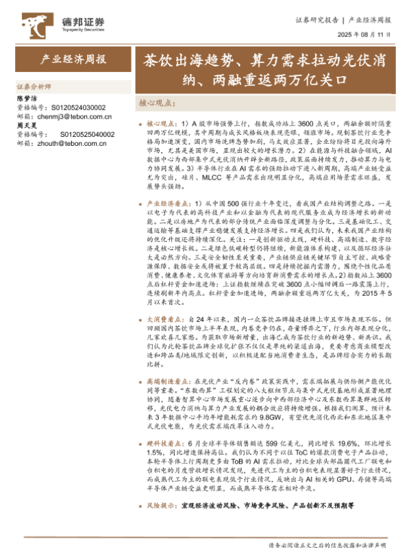 【德邦证券】【20250811】产业经济周报:茶饮出海趋势、算力需求拉动光伏消纳、两融重返两万亿关口-17页 证券期货研究报告