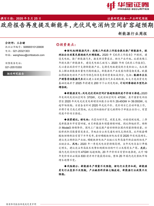 【华宝证券】【20200525】20200525-华宝证券-新能源行业周报:政府报告再度提及新能车,光伏风电消纳空间扩容超预期-19页 行业研究