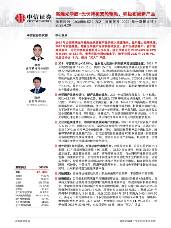 【中信证券】【20220426】2021年年报及2022年一季报点评:高端光学膜+光伏背板双轮驱动,积极布局新产品-4页 行业研究