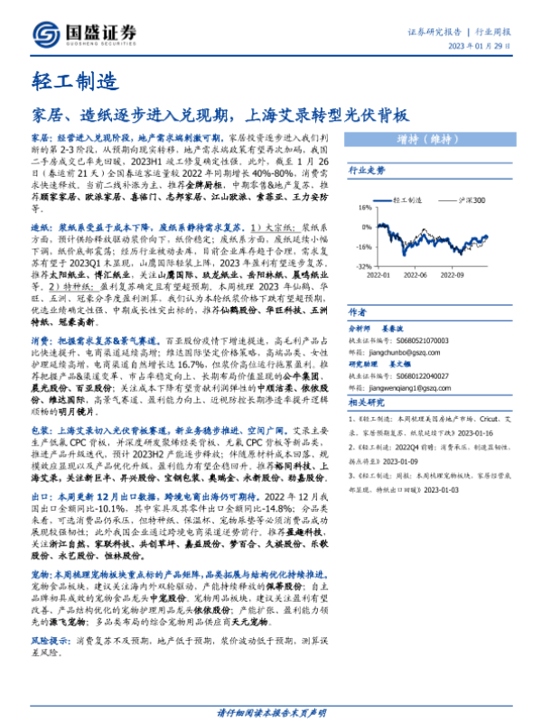 【国盛证券】【20230129】轻工制造行业周报:家居、造纸逐步进入兑现期,上海艾录转型光伏背板-51页 行业研究