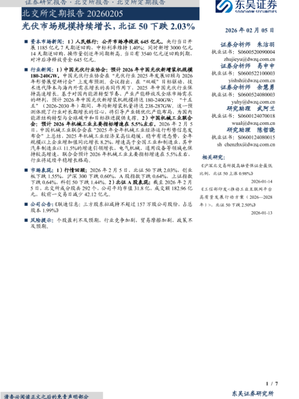 【东吴证券】【202602】光伏市场规模持续增长,北证50下跌2.03%-7页 证券期货研究报告