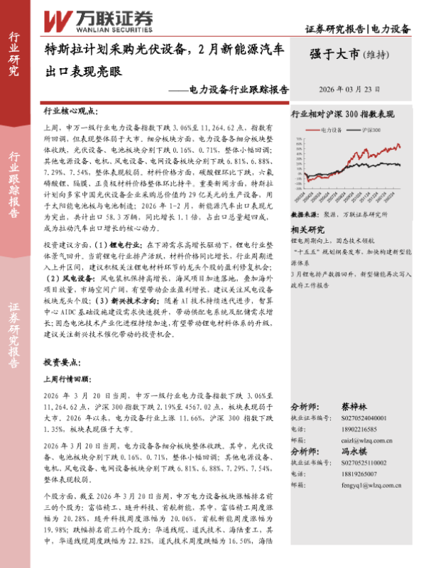 【万联证券】【202603】特斯拉计划采购光伏设备,2月新能源汽车出口表现亮眼-10页 证券期货研究报告