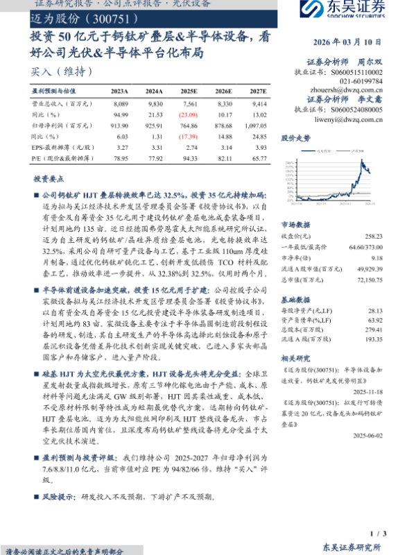 【东吴证券】【202603】投资50亿元于钙钛矿叠层&半导体设备,看好公司光伏&半导体平台化布局-3页 证券期货研究报告