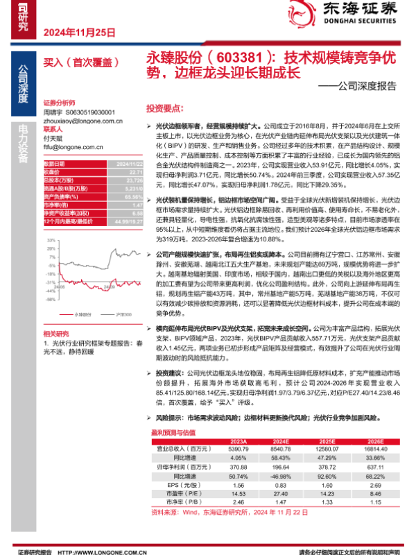 【东海证券】【20241125】永臻股份(603381)公司深度报告:技术规模铸竞争优势,边框龙头迎长期成长-24页 行业研究