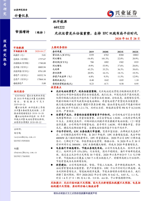 【兴业证券】【20200428】光伏运营龙头估值重塑,自持EPC双线布局平价时代-26页 行业研究