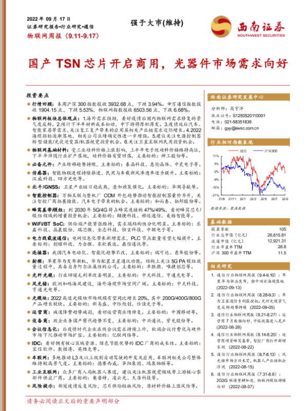 【西南证券】【20220917】20220917-西南证券-物联网周报:国产TSN芯片开启商用,光器件市场需求向好-19页 行业研究