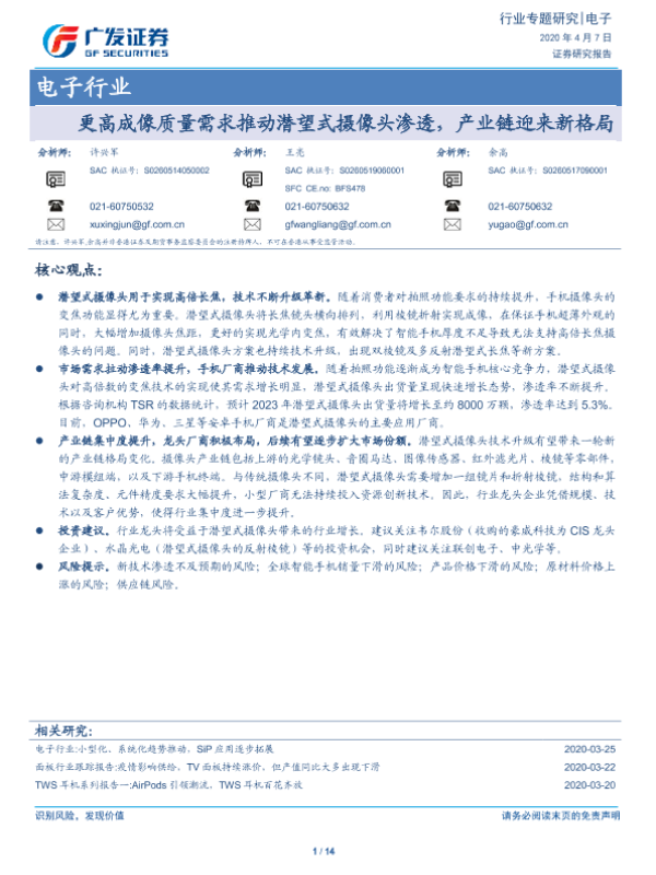 【广发证券】【20200407】电子行业专题研究:更高成像质量需求推动潜望式摄像头渗透,产业链迎来新格局-15页 行业研究