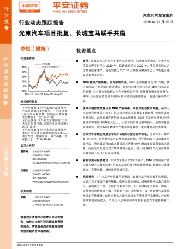 【平安证券】【20191125】汽车和汽车零部件行业动态跟踪报告:光束汽车项目批复、长城宝马联手共赢-6页 行业研究