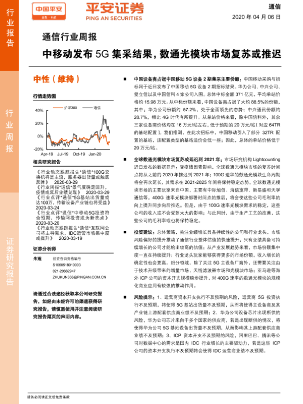 【平安证券】【20200406】20200406-平安证券-通信行业周报:中移动发布5G集采结果,数通光模块市场复苏或推迟-6页 行业研究