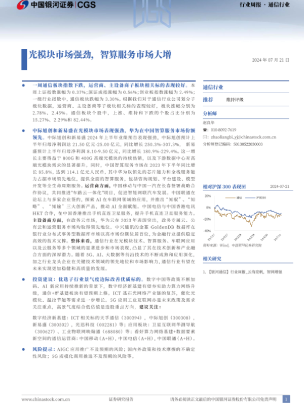 【银河证券】【20240721】20240721-中国银河-通信行业周报:光模块市场强劲,智算服务市场大增-18页 行业研究