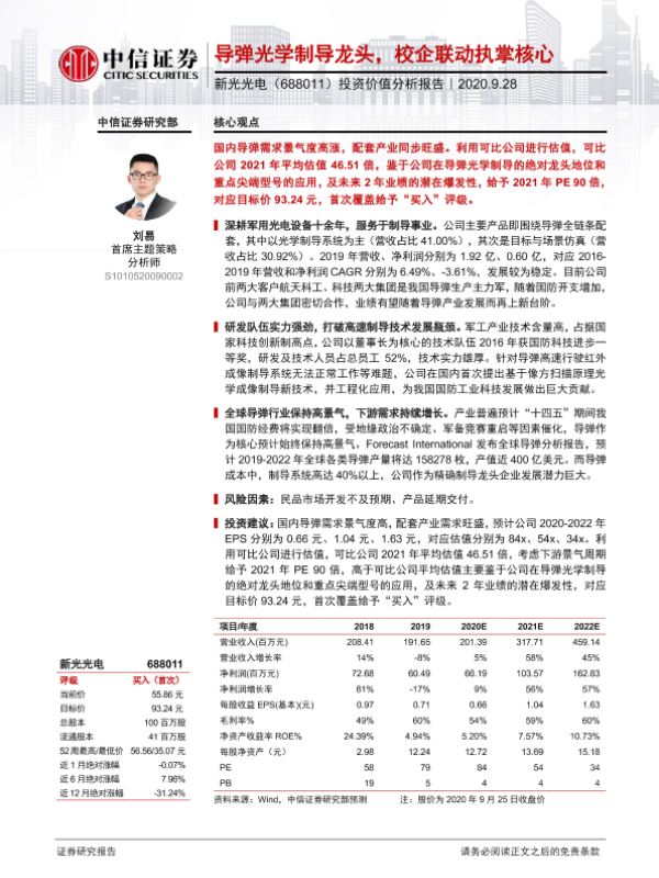 【中信证券】【20200928】20200928-中信证券-新光光电-688011.SH-投资价值分析报告:导弹光学制导龙头,校企联动执掌核心-30页 行业研究