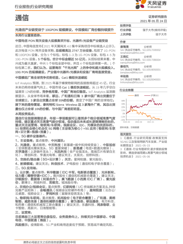 【天风证券】【20210524】通信行业研究周报:光通信产业链受益于10GPON规模建设,中国模组厂商份额持续提升-11页 行业研究