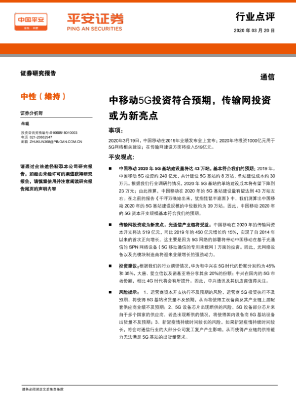 【平安证券】【20200320】通信:中移动5G投资符合预期,传输网投资或为新亮点-2页 行业研究