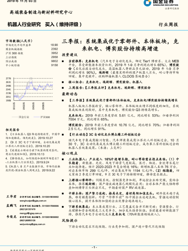 【国金证券】【20191103】20191103-国金证券-机器人行业研究三季报:系统集成优于零部件、本体板块,克来机电、博实股份持续高增速-14页 行业研究