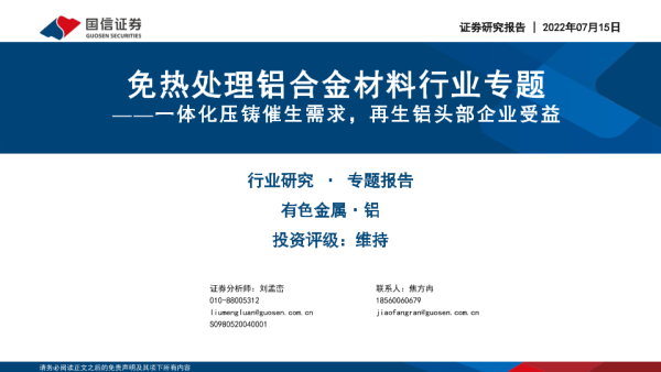 【国信证券】【20220715】免热处理铝合金材料行业专题:一体化压铸催生需求,再生铝头部企业受益-34页 行业研究