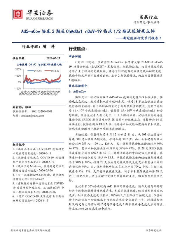 【华安证券】【20200723】新冠疫苗研发系列报告7:Ad5-nCov临床2期及ChAdOx1 nCoV-19临床1/2期试验结果点评-5页 行业研究