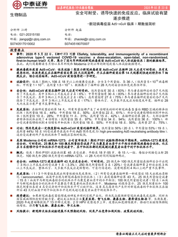【中泰证券】【20200523】生物制品-新冠病毒疫苗Ad5-nCoV临床Ⅰ期数据简析-5页 行业研究
