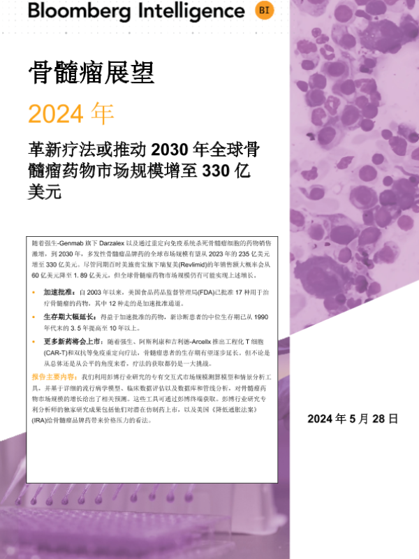 【彭博行业研究】【20240528】骨髓瘤展望:2024年革新疗法或推动2030年全球骨髓瘤药物市场规模增至330亿美元-100页 行业研究