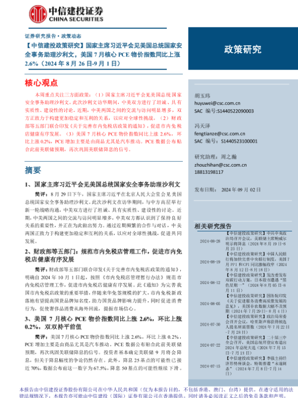 【中信建投证券】【20240902】国家主席习近平会见美国总统国家安全事务助理沙利文,美国7月核心PCE物价指数同比上涨2.6%-18页 行业研究