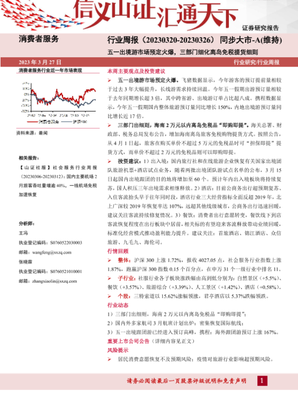 【山西证券】【20230327】消费者服务行业周报:五一出境游市场预定火爆,三部门细化离岛免税提货细则-11页 行业研究