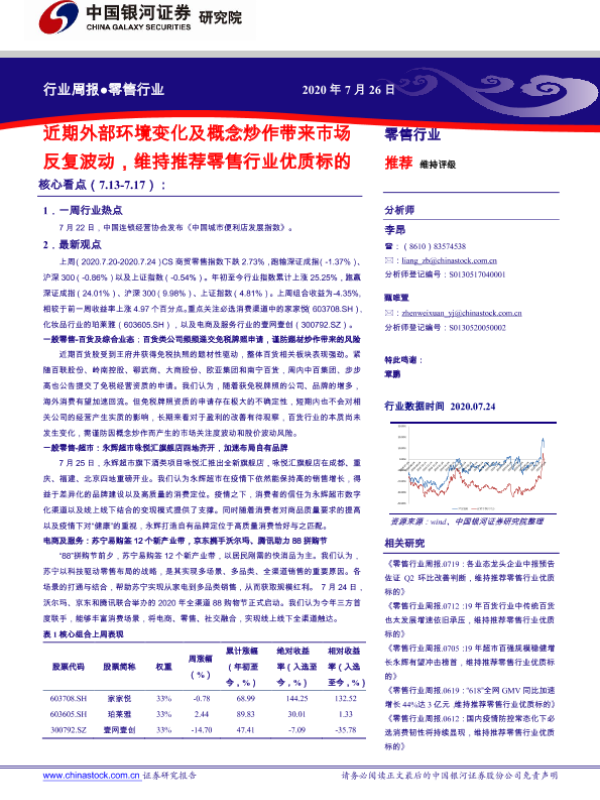 【银河证券】【20200726】零售行业周报:近期外部环境变化及概念炒作带来市场反复波动,维持推荐零售行业优质标的-41页 行业研究